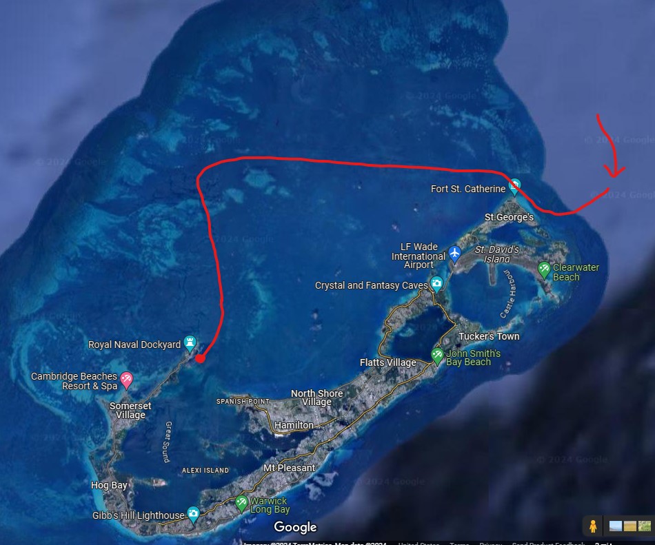 This could only mean that we were getting very close! Bermuda is surrounded by a very imposing reef, especially from the North, that extends out over 10 miles. Over the years, there have been hundreds of shipwrecks from those who have tried to navigate through the labyrinth of razor-sharp coral. Where most cruise ships dock (and especially the larger ones) is at the Royal Naval Dockyard, on the far East end of the island. The only safe way to get there is to enter into the reef system on the far west end of the island. The approach comes very close to Fort St. Catherine on the extreme Northwest corner. Then after rounding the corner, the channel heads almost due East. If you didn’t know, it would almost seem like you’re passing the island by because when you first see land, you get VERY close to it. Then, it fades away as you’re again miles offshore until the ship makes the 90-degree turn to the South to enter the Great Sound and the dockyard.