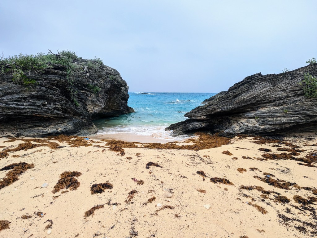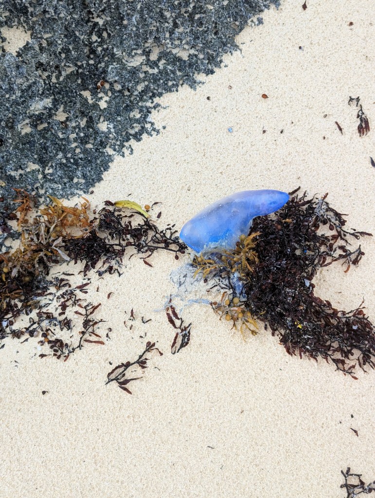 I was busy taking pictures of the rock formations and the waves crashing upon them and did not notice that I was walking and standing in a place where several Portuguese Man-O-Wars had washed up on the shore. Whoops! l had read that they were a common occurrence in Bermuda, and whether or not you’ll see them washed up on the shore depends on the wave action and wind direction. Once I noticed one, they seemed to be everywhere. It was time to get going anyway, as it was starting to rain steadily.
