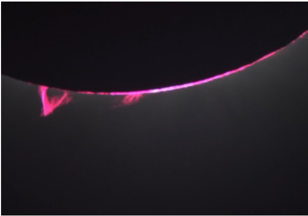 The moon was traversing the sun in a direction from about 4:00 to 10:00. As totality wore on, more and more of the lower portion of the Corona was exposed. It quickly became obvious that there was an enormous fiery prominence visible to the naked eye. It just added to the splendor.